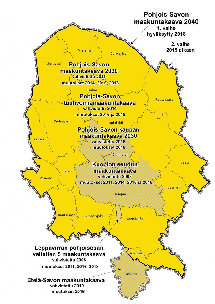 Pohjois-Savossa on voimassa kaavamerkintöjä kolmesta maakuntakaavasta: Kuopion seudun maakuntakaava (2008) Siilinjärven Yaran T/Ek 13.800 ja T/kem 13.803 merkintöjen osalta, Pohjois-Savon maakuntakaavan 2040, 1. vaihe (2019) päivityksin sekä Pohjois-Savon maakuntakaavan 2040, 2. vaihe (2025). Kts. Yhdistelmäkaava.