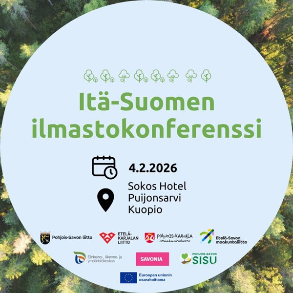 Vuosittainen Itä-Suomen ilmastokonferenssi järjestetään Kuopiossa 4.2.2026. Neljännen kerran järjestettävän konferenssin teemana on ilmastokestävät alueet ja kunnat. Tilaisuudessa esitellään esimerkkejä vaikuttavasta ilmastotyöstä ja työkaluista ilmastonmuutokseen sopeutumiseksi. Lisäksi tapahtumassa keskustellaan oikeudenmukaisesta siirtymästä kohti ilmastokestäviä alueita ja kuntia.