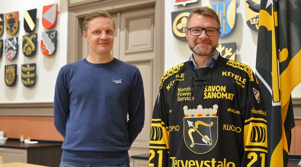 Pohjois-Savon uudistettu vaakuna julkistettiin Savon derbyssä marraskuussa 2021. KalPan toimitusjohtaja Toni Saksman (vas.) ja maakuntajohtaja Marko Korhonen esittelivät otteluun teetettyä erikoispaitaa.