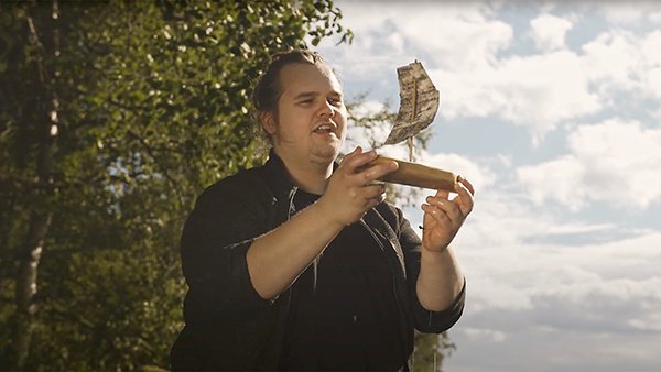 Kuvakaappaus musiikkivideosta, Jami pitelee käsissään kaarnalaivaa 08.12.2023