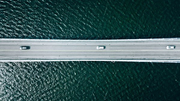 Ilmakuva sillasta, jossa kolme autoa veden ympäröimänä 04.08.2023
