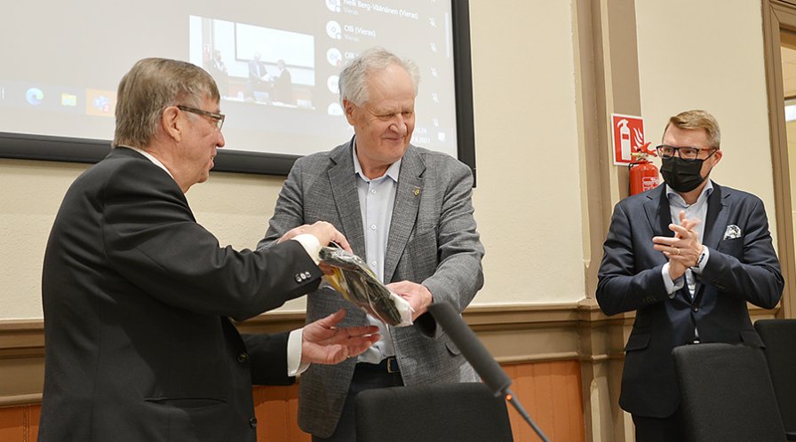 Maakuntahallituksen puheenjohtaja Seppo Kääriäinen (kesk.) ja maakuntajohtaja Marko Korhonen luovuttivat Kari Rajamäelle isännänviirin.