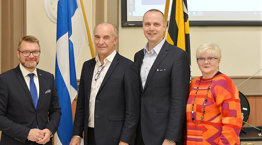 Maakuntajohtaja Marko Korhonen (vas.), Markku Eestilä, Antti Kivelä ja Tuula Väätäinen. Valtuuston puheenjohtajistosta kuvasta puuttuu 2. varapuheenjohtaja Riikka Pirkkalainen.