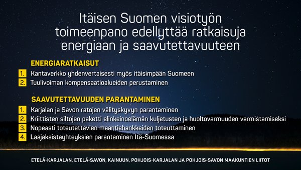 Itäisen Suomen visiotyön toimeenpano edellyttää ratkaisuja energiaan ja saavutettavuuteen. Kantaverkko on saatava yhdenvertaisesti myös itäisimpään Suomeen ja tuulivoiman kompensaatioalueita tulee perustaa, sillä puolustusvoimien linjaukset ilmavalvonnan suhteen ovat käytännössä estäneet tuulivoiman rakentamisen itäisimmässä Suomessa.