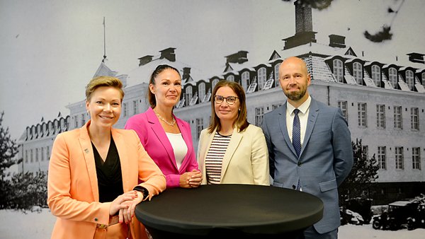"Täällä on mahikset kohillaan. Ilahduttavaa on, että teillä on yhteinen näkemys siitä, mitä pitää edistää ja mitä pitää viedä eteenpäin", kiitteli ministeri Lulu Ranne (toinen vas.) Yrityskeskus Innocumissa pidetyssä tilaisuudessa. Kuvassa Tytti Määttä (vas.), Kaija Savolainen ja Siilinjärven kunnanjohtaja Janne Airaksinen.